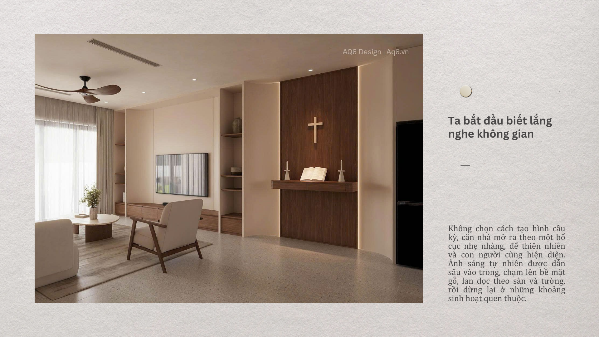 Gỗ không xuất hiện để phô diễn vân hay tạo ấn tượng thị giác mạnh, mà được sử dụng như một lớp nền trầm, giữ lại sự ấm áp cho toàn bộ không gian.