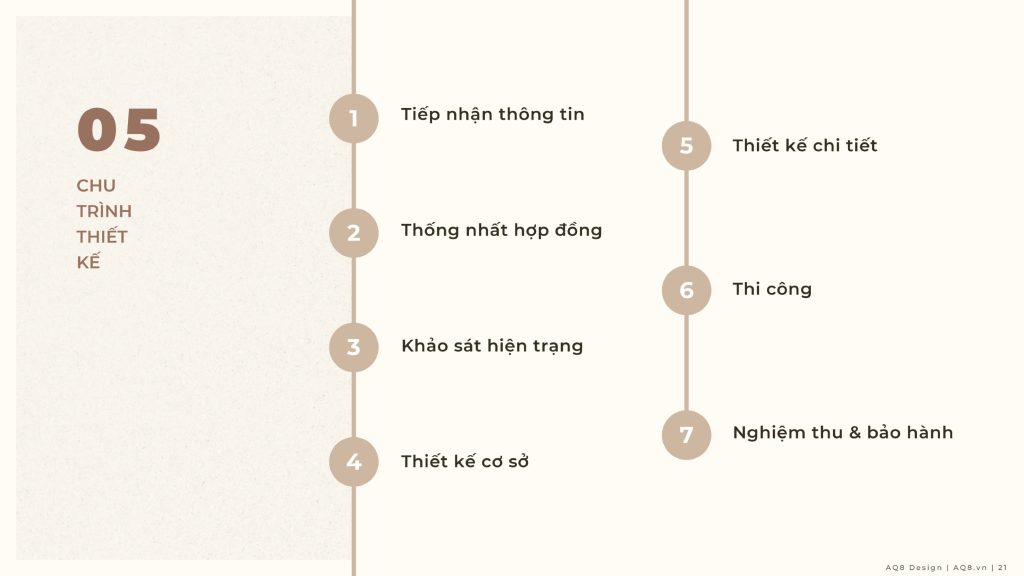 Gồm khảo sát – ý tưởng – thiết kế chi tiết – duyệt – thi công – bàn giao.