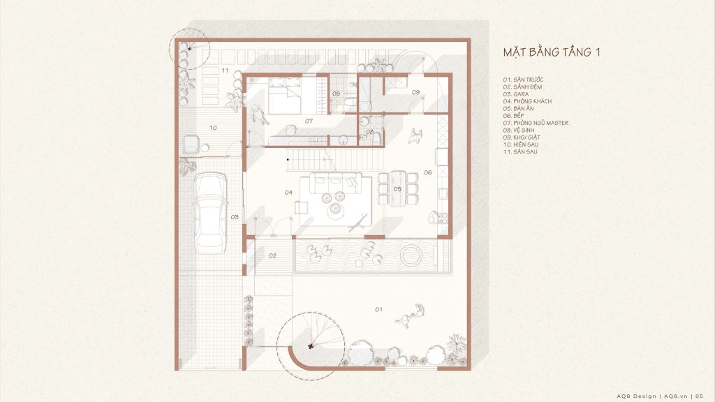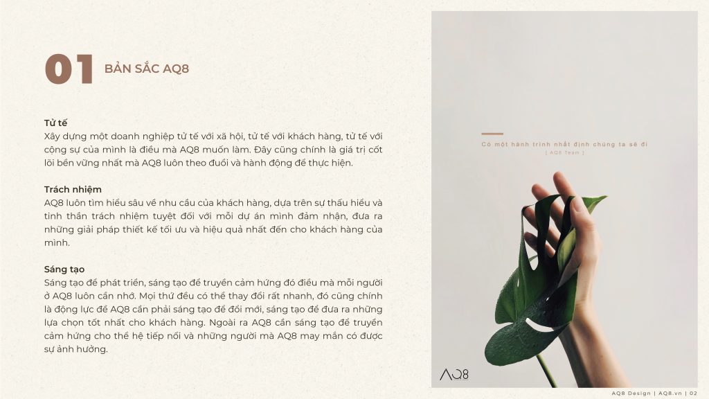 - Thiết kế cơ sở: Lên ý tưởng, mặt bằng và định hướng thẩm mỹ tổng thể. Dựa trên phong cách tối giản tinh tế, AQ8 đề xuất bản vẽ 3D chi tiết.