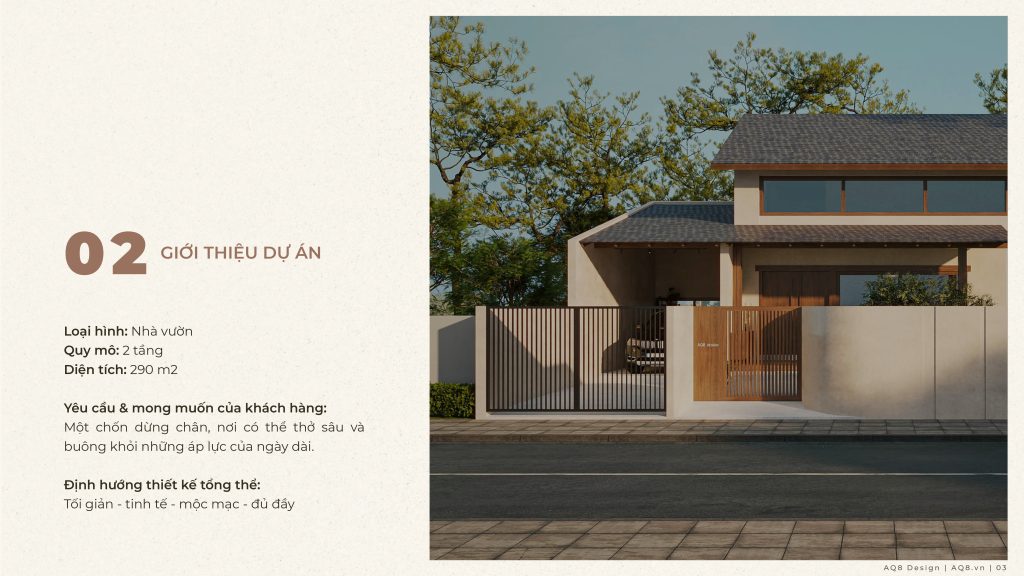 Ngôi Nhà vườn 2 tầng với diện tích 290m² được hình thành từ mong muốn về một chốn trú yên – nơi gia chủ có thể hít thở sâu, tạm buông khỏi nhịp sống bộn bề. Thiết kế lấy tối giản – tinh tế – mộc mạc – đủ đầy làm kim chỉ nam, tạo nên một không gian sống vừa thoáng đãng, vừa ấm áp. Từ mặt tiền với những đường nét gọn ghẽ đến chất liệu gỗ và ánh sáng tự nhiên, mọi chi tiết đều hướng đến cảm giác bình yên, thư thả, nơi mỗi thành viên có thể trở về và thật sự nghỉ ngơi.