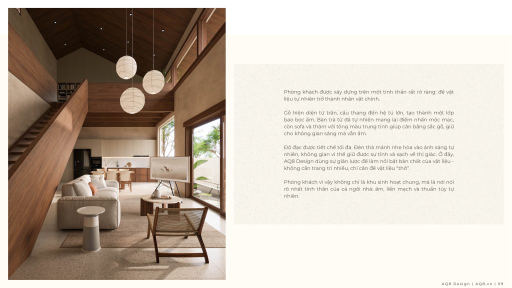 Phòng khách vì vậy không chỉ là khu sinh hoạt chung, mà là nơi nói rõ nhất tinh thần của cả ngôi nhà: ấm, liền mạch và thuần túy tự nhiên.