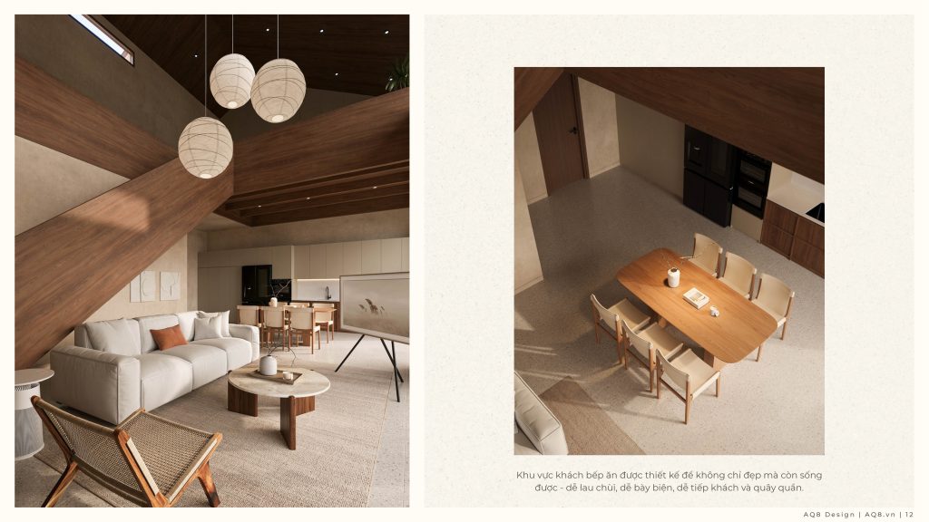Không gian này được thiết kế để không chỉ đẹp mà còn sống được – dễ lau chùi, dễ bày biện, dễ tiếp khách và quây quần, đúng tinh thần “tối giản mà đủ đầy” của toàn bộ căn nhà.