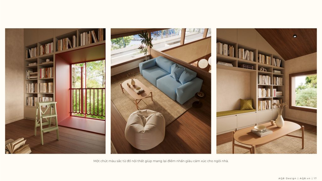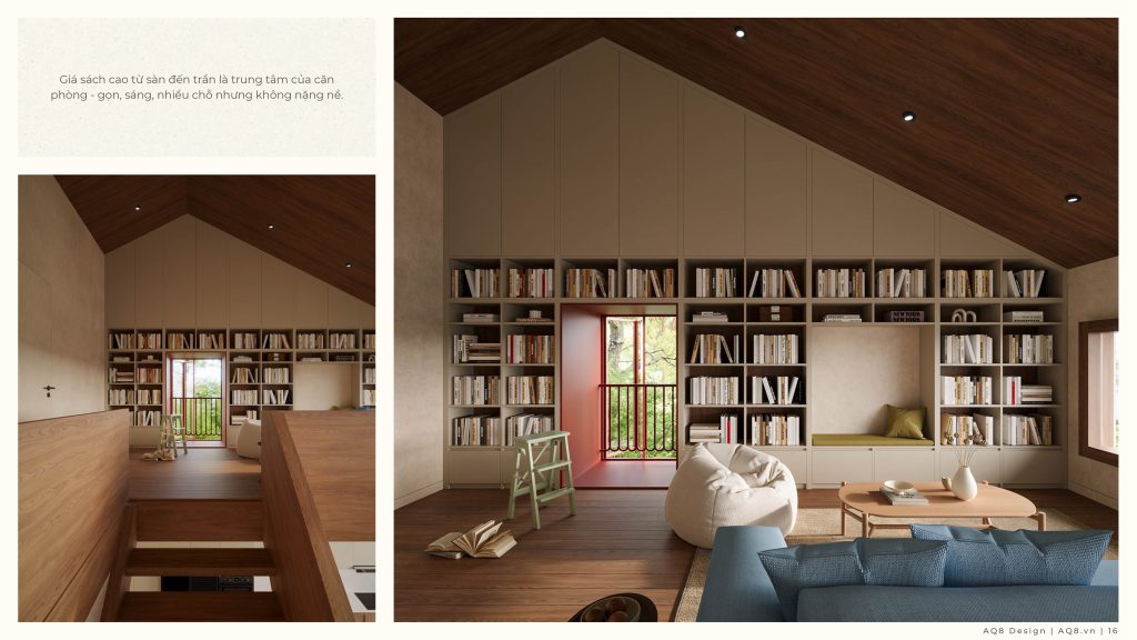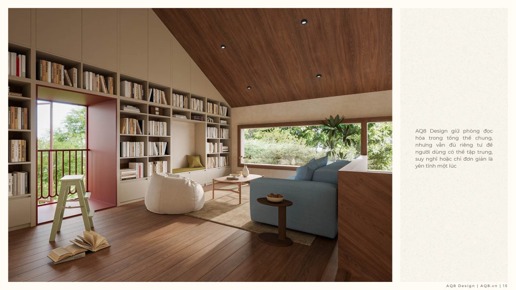 AQ8 Design giữ phòng đọc hòa trong tổng thể chung, nhưng vẫn đủ riêng tư để người dùng có thể tập trung, suy nghĩ hoặc chỉ đơn giản là yên tĩnh một lúc. Đây không chỉ là một căn phòng; nó là trạng thái tĩnh lặng mà ngôi nhà dành riêng cho những ai yêu sách và yêu sự chậm rãi.