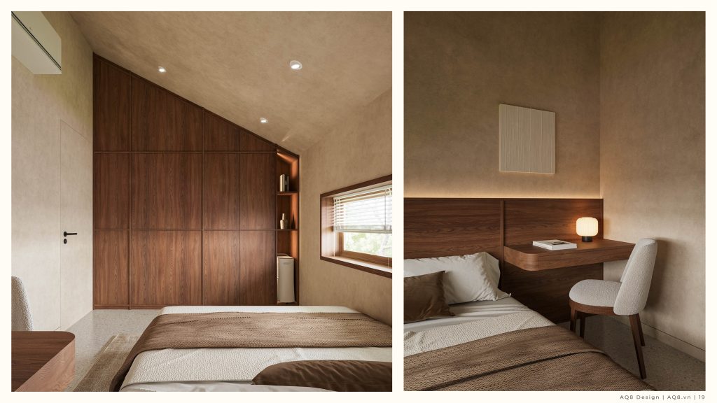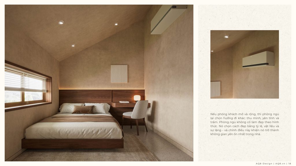 Phòng ngủ không cố làm đẹp theo hình thức. Nó chọn cách đẹp bằng tỷ lệ, vật liệu và sự lặng – và chính điều đó khiến nó trở thành không gian yên ổn nhất trong nhà.