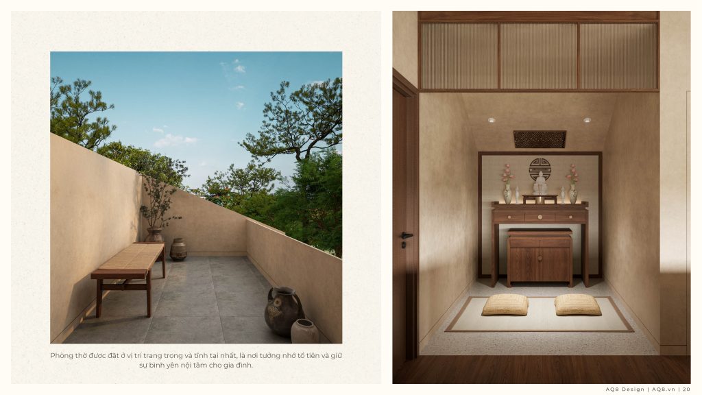 AQ8 Design ưu tiên sự giản lược nhưng vẫn trang nghiêm: gỗ tự nhiên làm chủ đạo, ánh sáng dịu nhẹ, tông nâu – vàng nhạt tạo cảm giác ấm áp, trầm tĩnh. Bàn thờ đặt cao, đối xứng, các vật phẩm thờ được tối giản để phù hợp với phong cách mộc mạc của căn nhà.